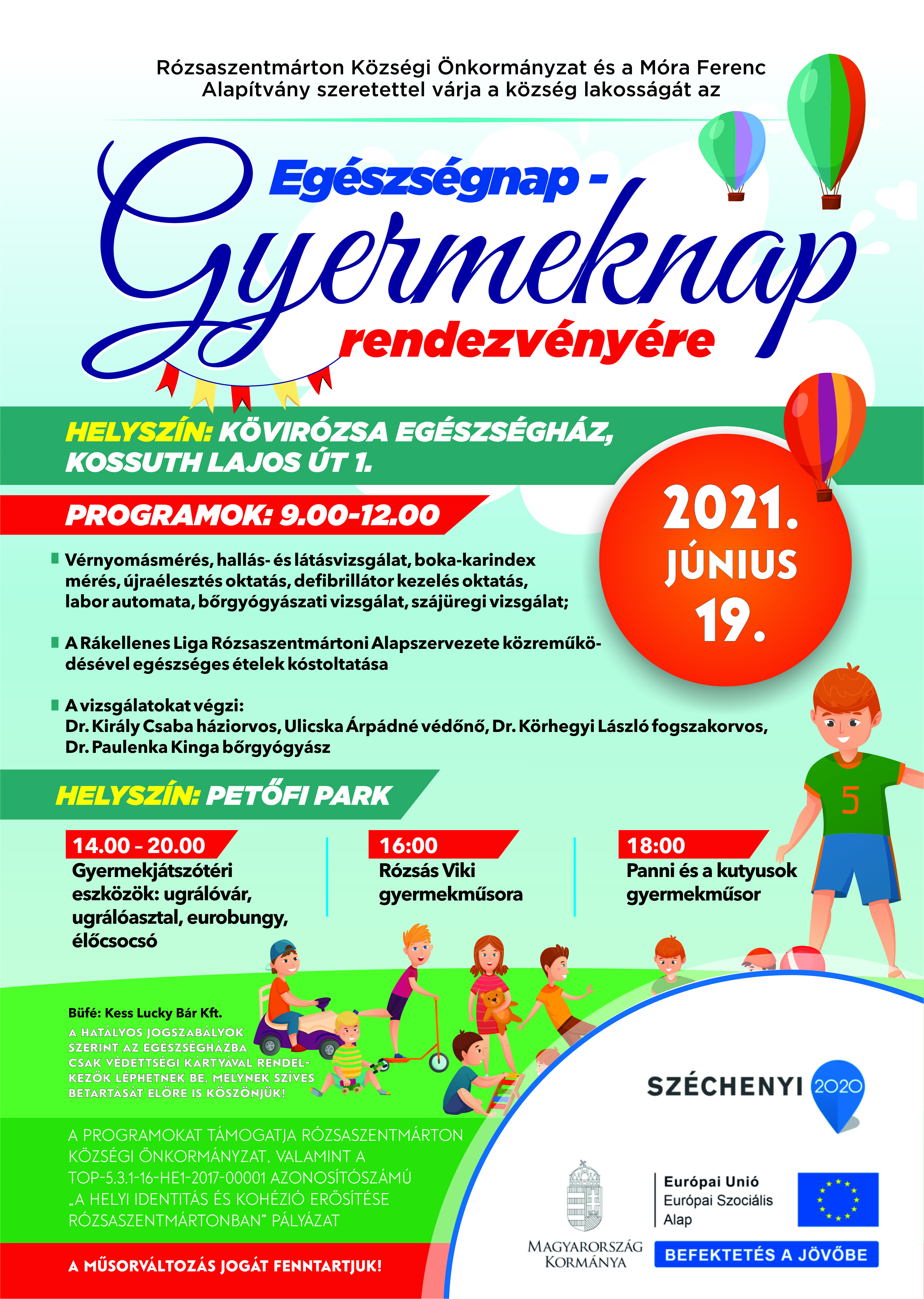 Rózsaszentmárton Községi Önkormányzat és a Móra Ferenc Alapítvány szeretettel várja a község lakosságát az Egészségnap rendezvényre 2021. június 19-én, 9-12 óra között a Kövirózsa Egészségházba, majd 14-20 óra között a Petőfi Parkba.