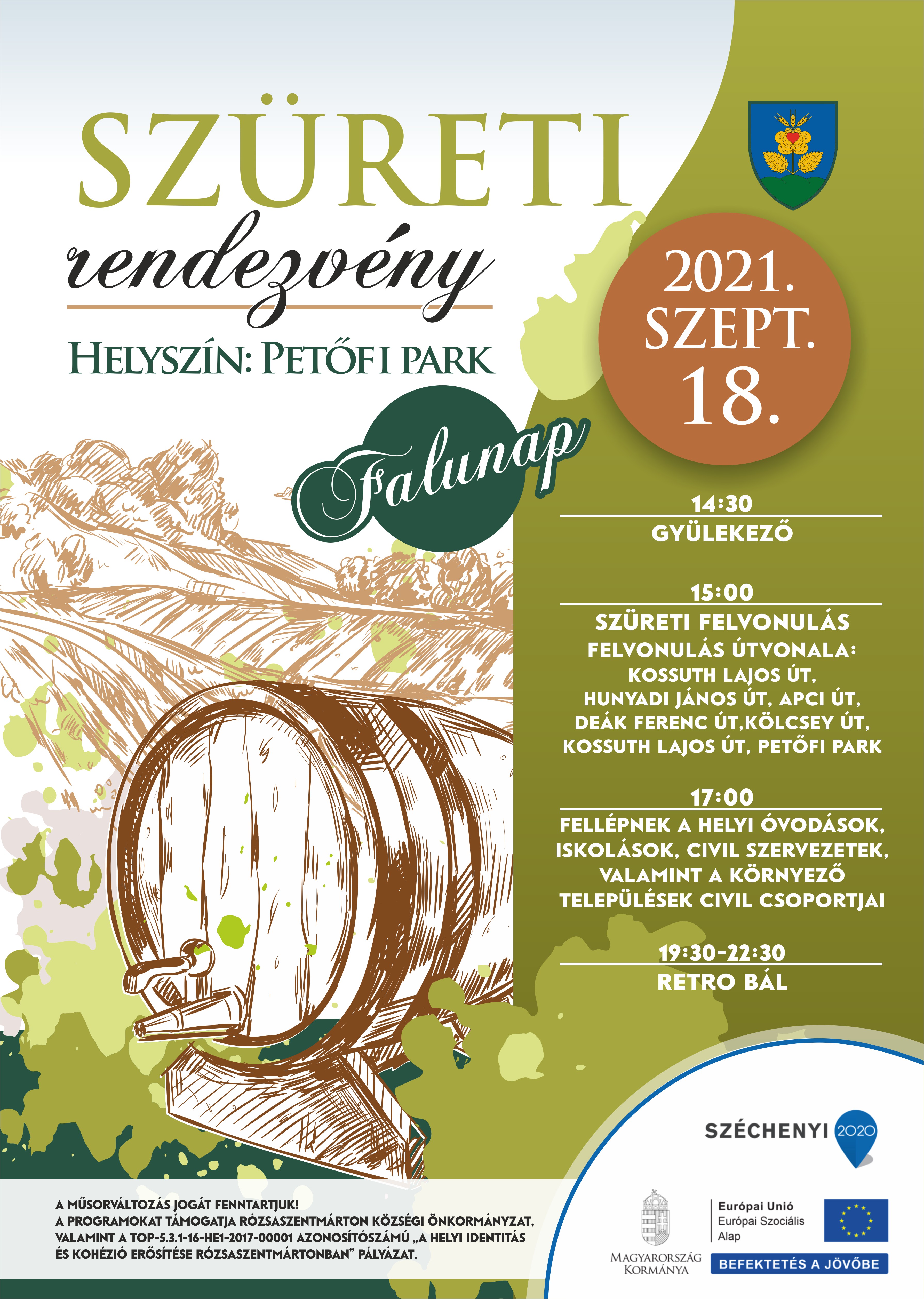 Rózsaszentmárton Községi Önkormányzat szeretettel várja a község lakosságát a Szüreti Rendezvényre 2021. szeptember 18-án (szombaton) 14.30 órától a Petőfi Parkba.